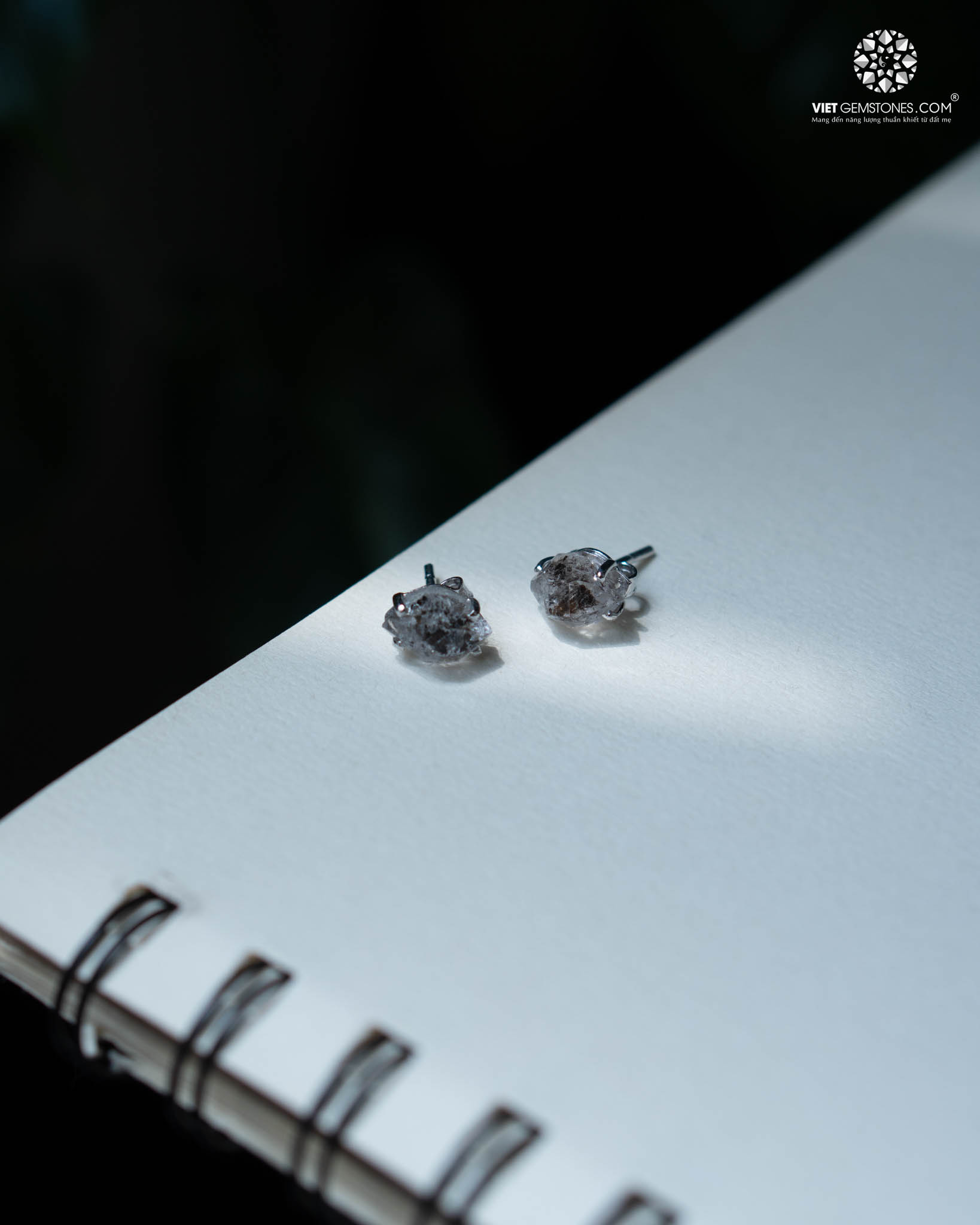 Bông tai bạc thiết kế đơn giản, tập trung làm nổi bật vẻ đẹp tự nhiên của viên đá Herkimer Diamond.