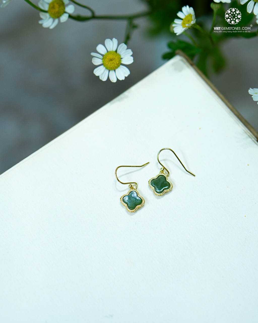 Ngọc bích sở hữu sắc xanh dịu mát, bề mặt mịn và độ bóng tự nhiên, tượng trưng cho sự bình an và may mắn. Mỗi viên ngọc có sắc độ và vân đá khác nhau, hoàn toàn hình thành trong tự nhiên, tạo nên nét độc bản cho từng đôi bông tai. Thiết kế cỏ bốn lá tòng teng giúp bông tai chuyển động nhẹ nhàng, tạo điểm nhấn tinh tế và duyên dáng.