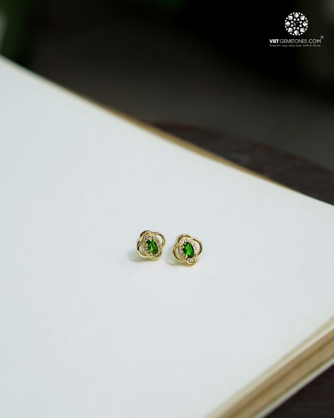 Điểm nhấn là viên đá Diopsite xanh lục ở trung tâm, được cắt oval, sắc xanh trong và sâu, tạo cảm giác tươi mới và sang trọng. Bao quanh là viền đá nhỏ lấp lánh, giúp tăng độ bắt sáng và làm nổi bật viên đá chính.
