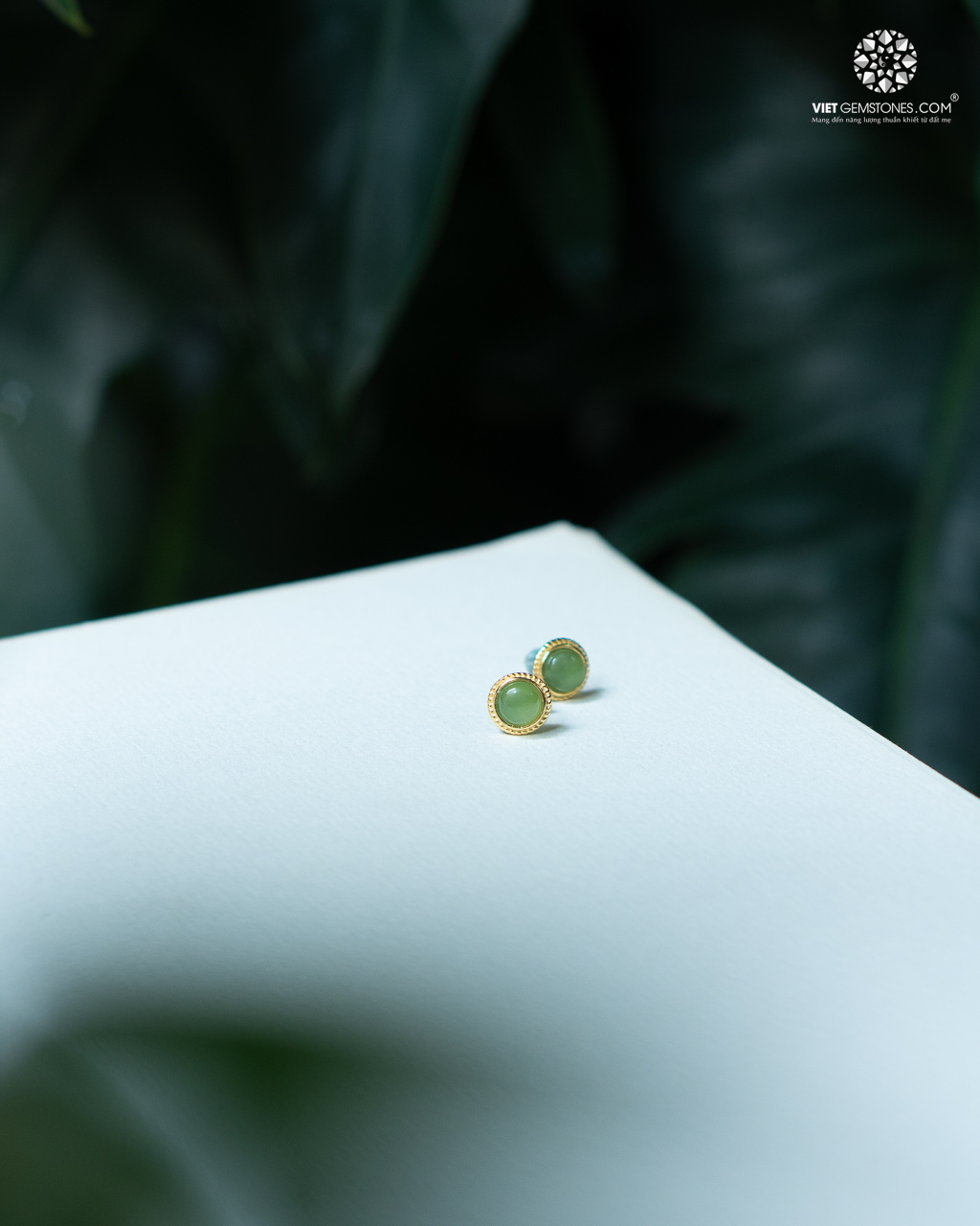 Mang phong cách tối giản nhưng tinh tế, đôi bông tai nổi bật với viên Ngọc Bích ở vị trí trung tâm, được bao bọc bởi viền bạc phủ vàng mềm mại. Thiết kế nhỏ gọn, hiện đại, dễ dàng kết hợp với mọi phong cách – từ trang phục thường ngày đến trang phục dạ tiệc.