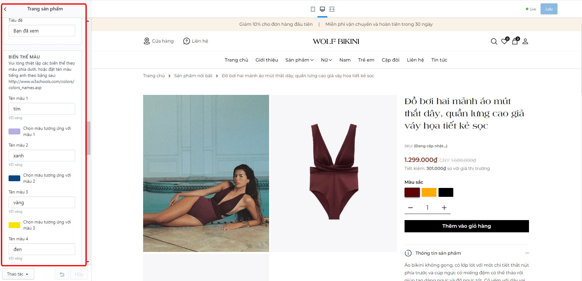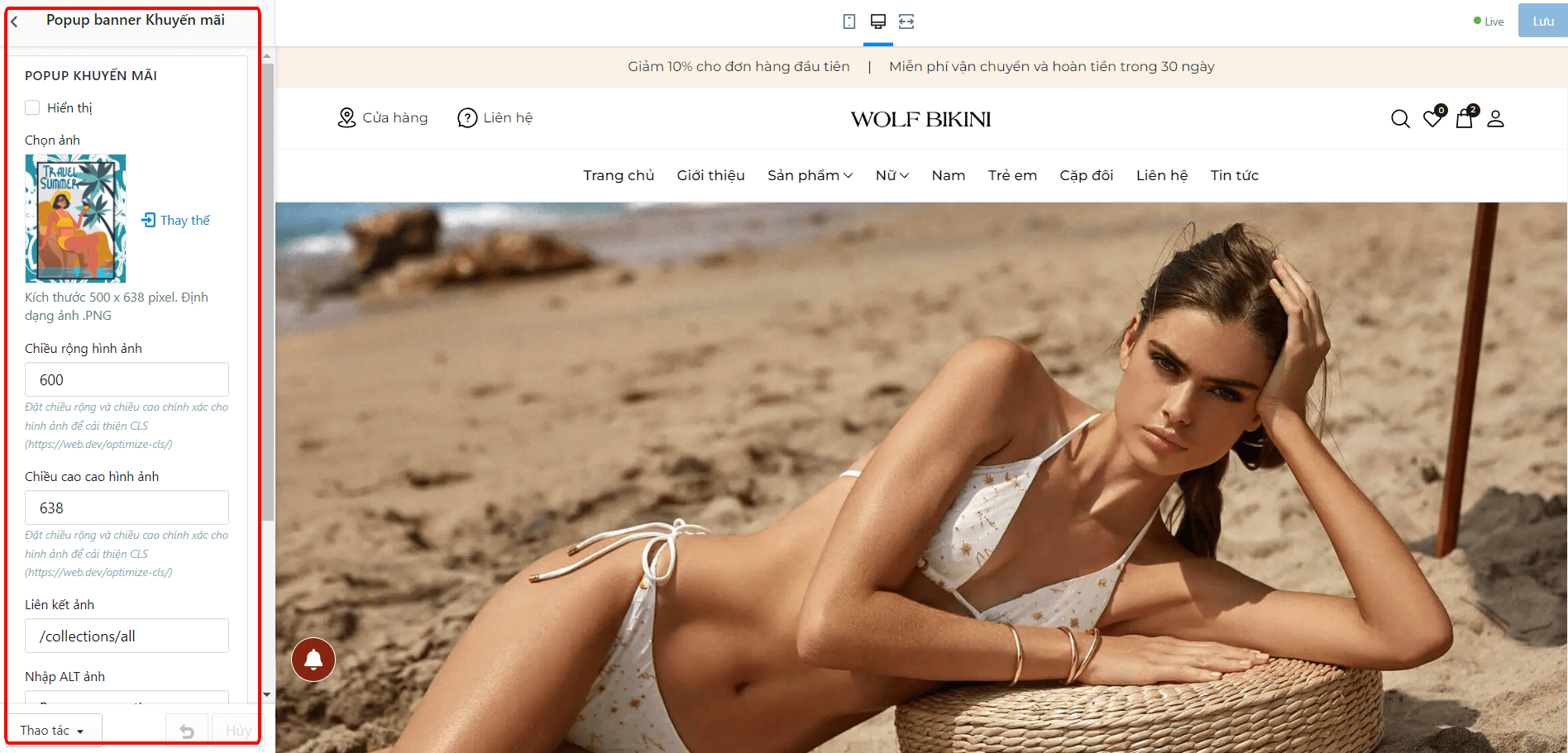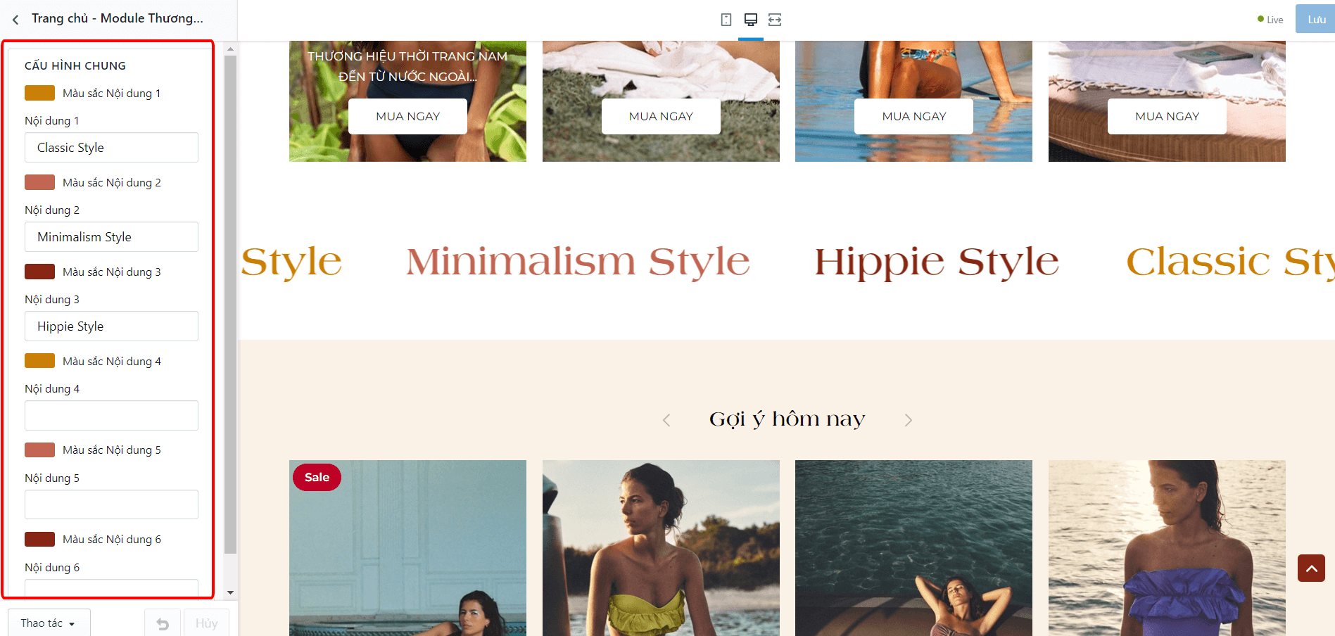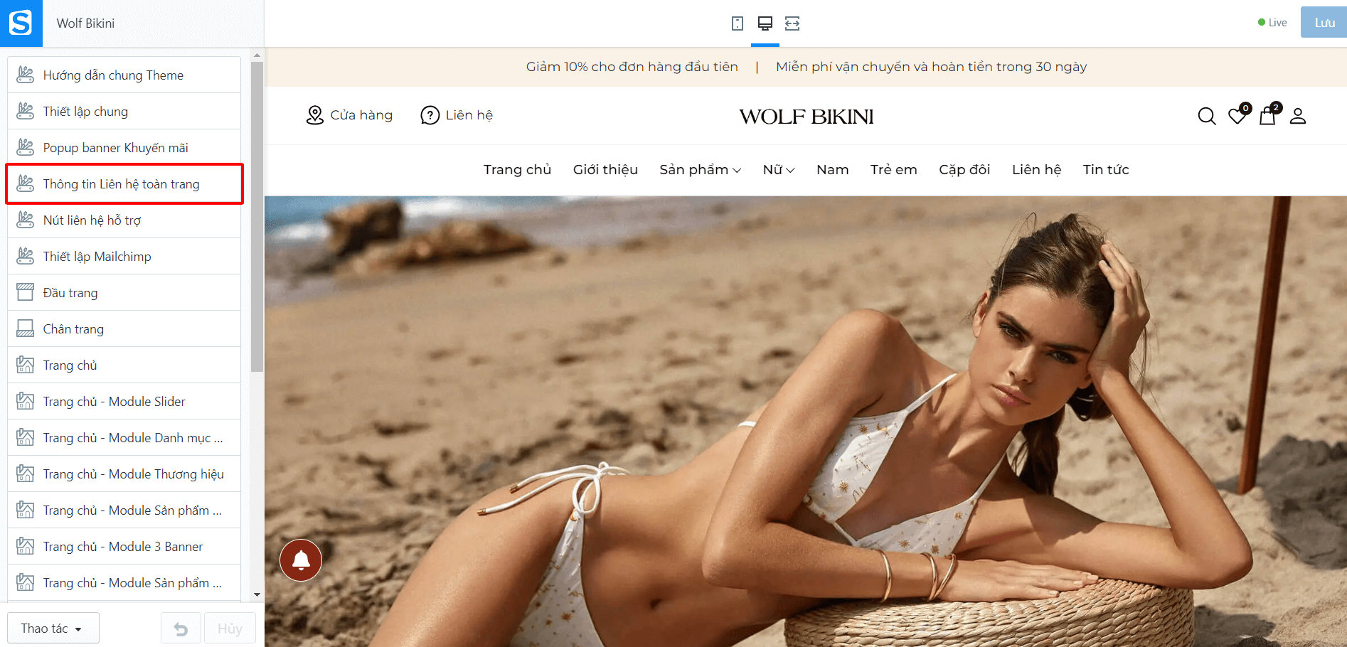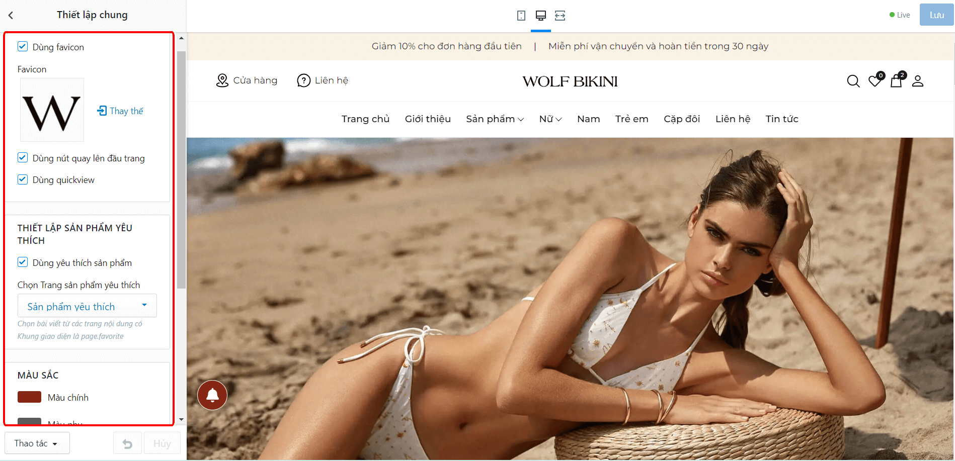 Hướng dẫn thiết lập các mục cơ bản như Logo, Thông tin liên hệ, Màu sắc, Popup Khuyến mãi, Nút liên hệ, Đầu trang, Chân trang