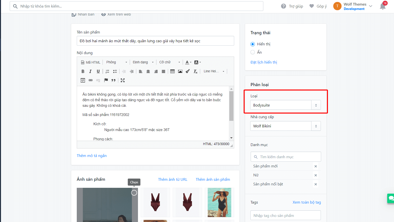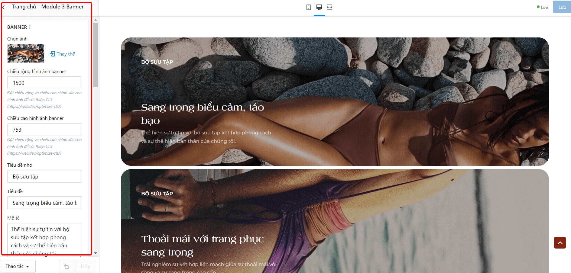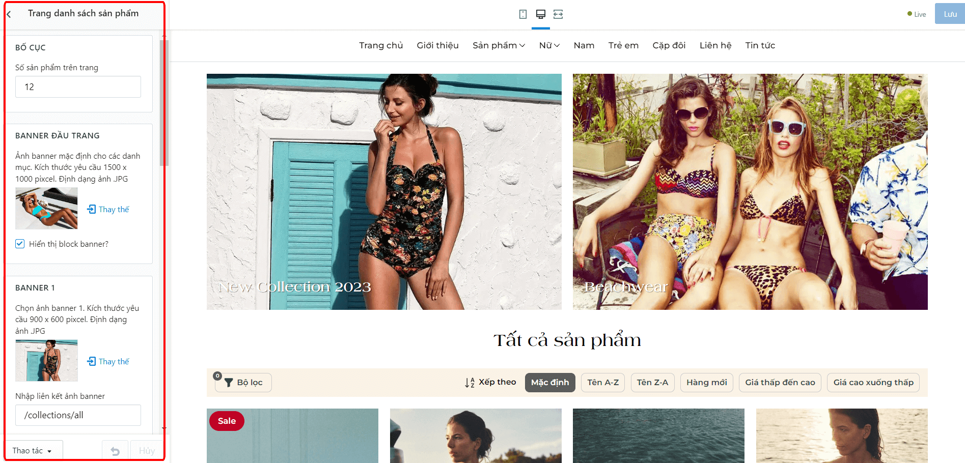 Tại đây cung cấp các thiết lập của Ảnh danh mục, Menu danh mục sản phẩm, tắt mở bộ lọc sản phẩm.