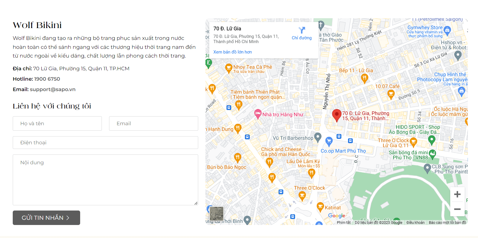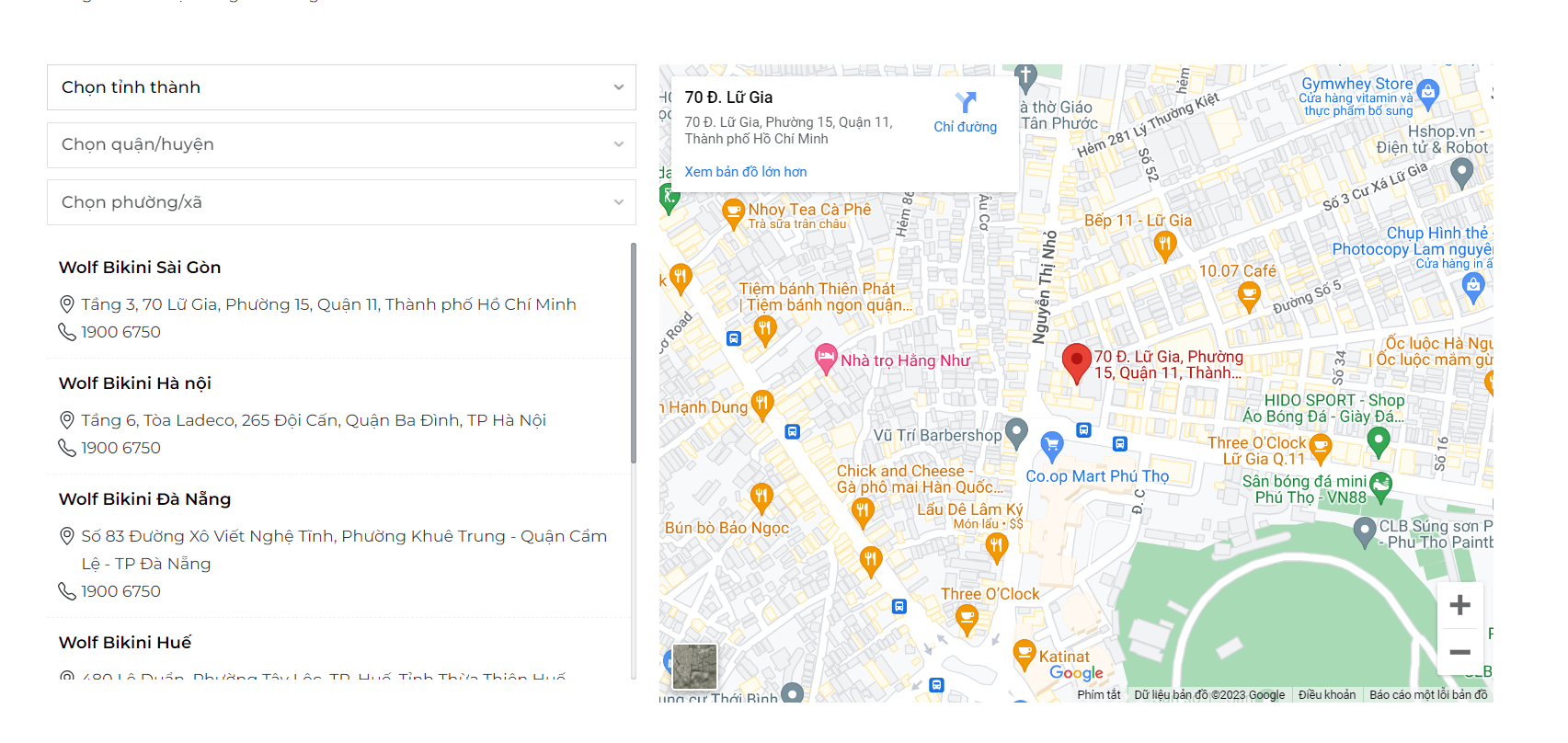 {name:"Wolf Bikini Sài Gòn", address: "Tầng 3, 70 Lữ Gia, Phường 15, Quận 11, Thành phố Hồ Chí Minh",city: "Hồ Chí Minh",district: "Quận 10",ward: "Phường 15", phone:"1900 6750", url: "https://www.google.com/maps/embed?pb=!1m18!1m12!1m3!1d3919.518261716127!2d106.65095971411642!3d10.771561562230547!2m3!1f0!2f0!3f0!3m2!1i1024!2i768!4f13.1!3m3!1m2!1s0x31752f4964c382dd%3A0xb61978d7651a271f!2zUGjhuqduIG3hu4FtIHF14bqjbiBsw70gYsOhbiBow6BuZyBTYXBvIC0gSOG7kyBDaMOtIE1pbmg!5e0!3m2!1svi!2s!4v1649778540165!5m2!1svi!2s"},