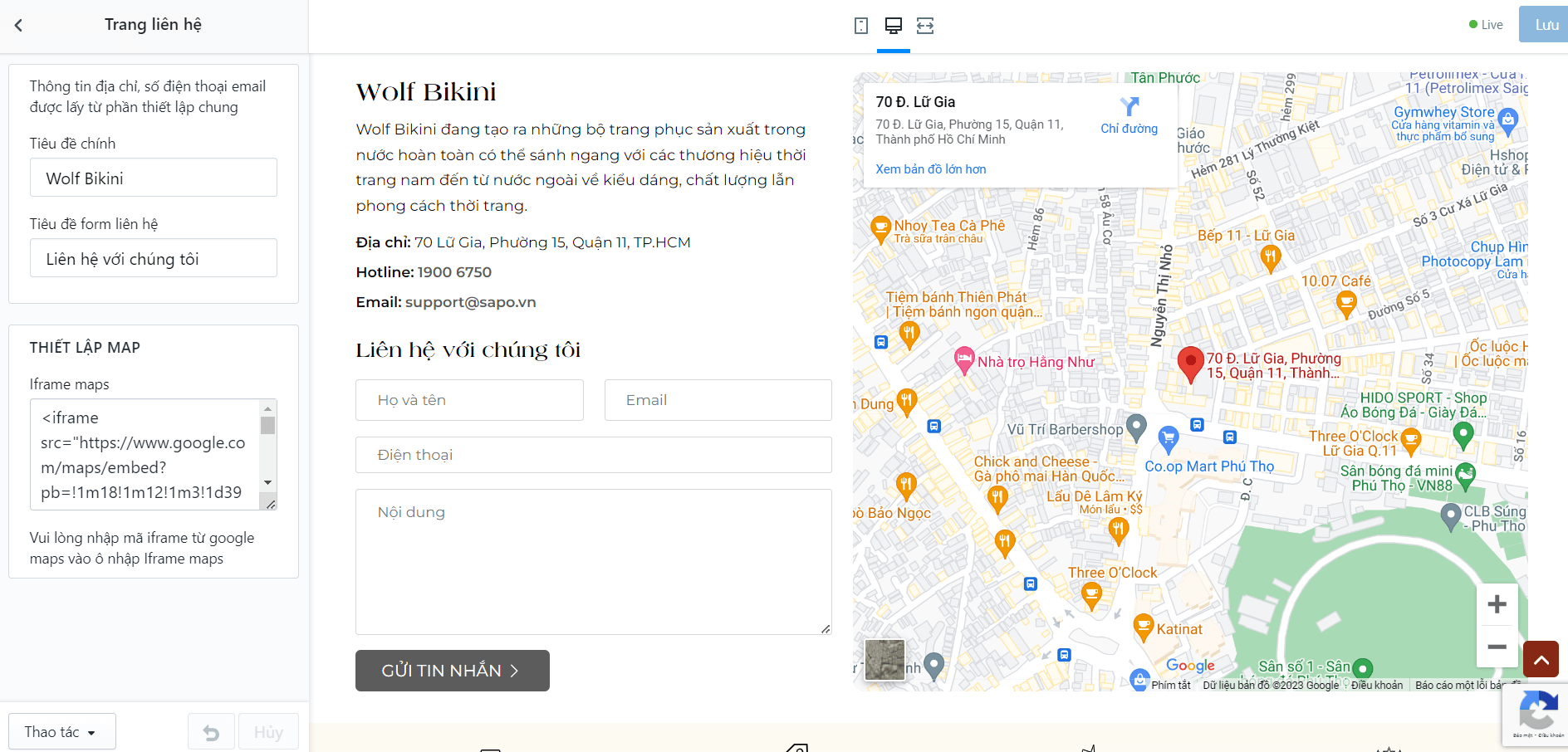 Thiết lập tiêu đề form liên hệ và bản đồ. Thông tin liên hệ thiết lập ở mục Thiết lập cơ bản > Thông tin liên hệ