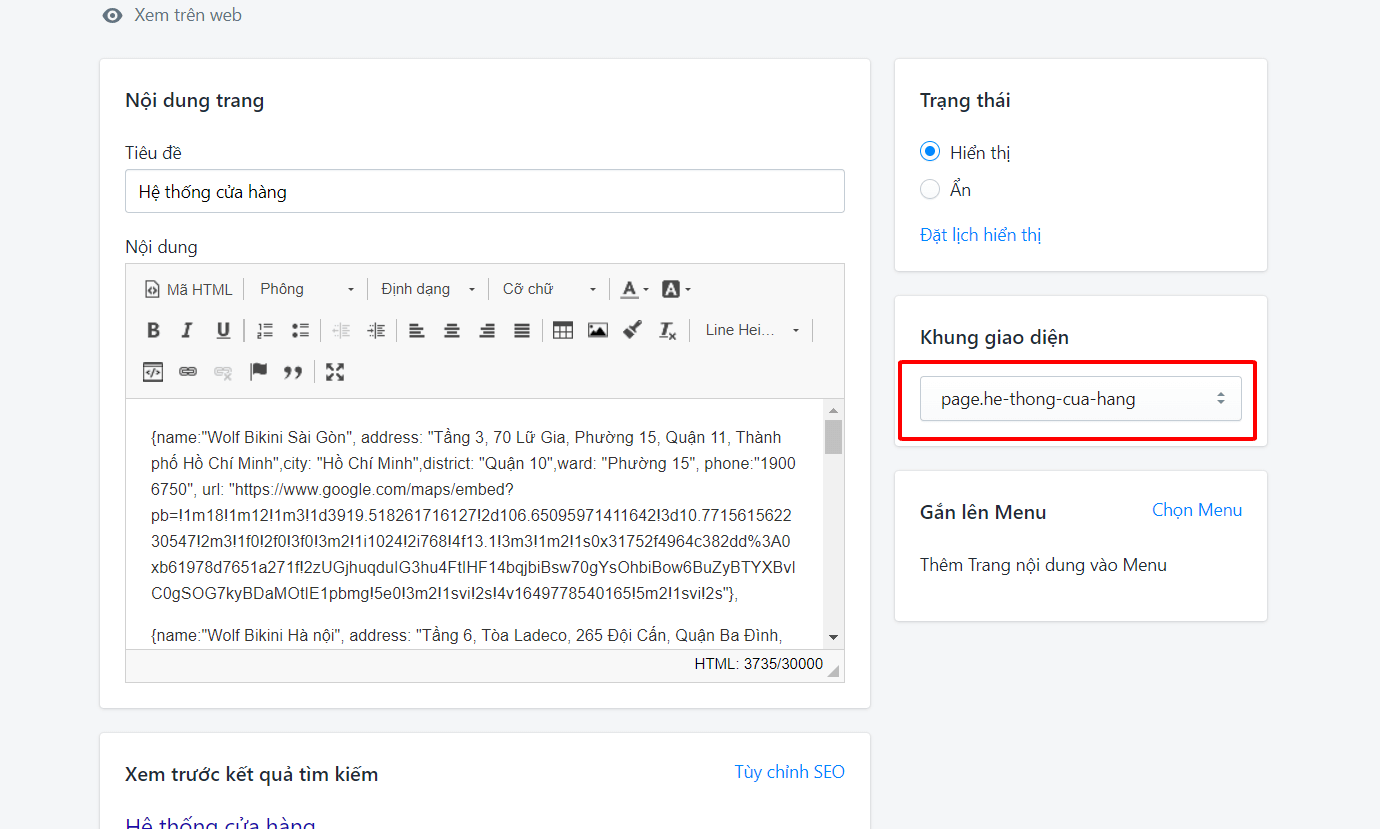Tạo 1 trang nội dung và chọn khung giao diện là page.he-thong-cua-hang