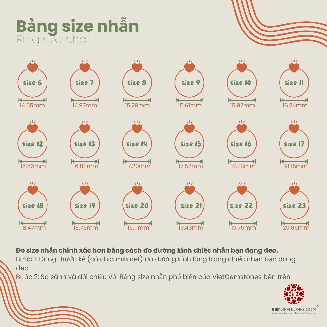 VietGemstones đã hướng dẫn cách chọn size nhẫn chuẩn nhất bằng hai phương pháp, các bước thực hiện đơn giản, hướng dẫn đầy đủ và chi tiết nên các bạn hãy chọn cho mình một phương pháp phù hợp để tiến hành thực hiện đo và chọn size nhẫn chuẩn xác nhất các bạn nhé. Khi chọn được size nhẫn các bạn hãy để lại ghi chú size vào sản phẩn nhẫn các bạn đặt để VietGemstones gửi đến các bạn sản phẩm vừa vặn nhất.