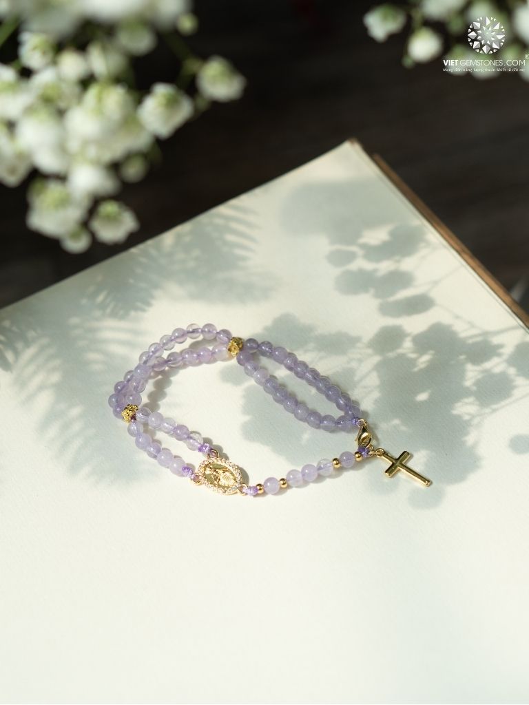 Lắc tay mân côi 50 kinh thạch anh tím là biểu tượng của đức tin, sự thanh tịnh và bình an nội tâm. Mỗi hạt chuỗi là một lời cầu nguyện dâng lên Thiên Chúa và Đức Mẹ Maria, giúp người đeo hướng tâm về sự tĩnh lặng, khiêm nhường và đời sống thiêng liêng sâu sắc.
