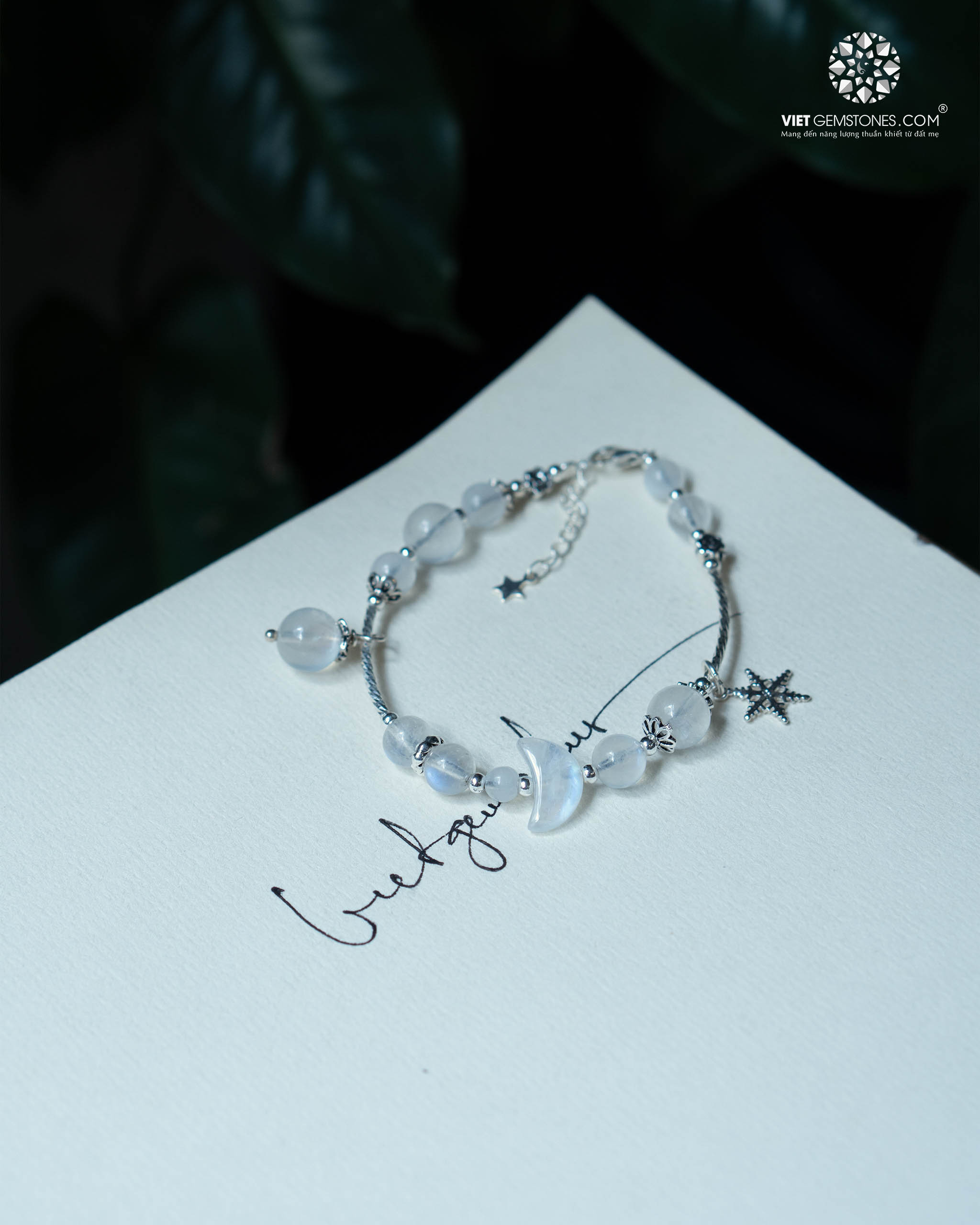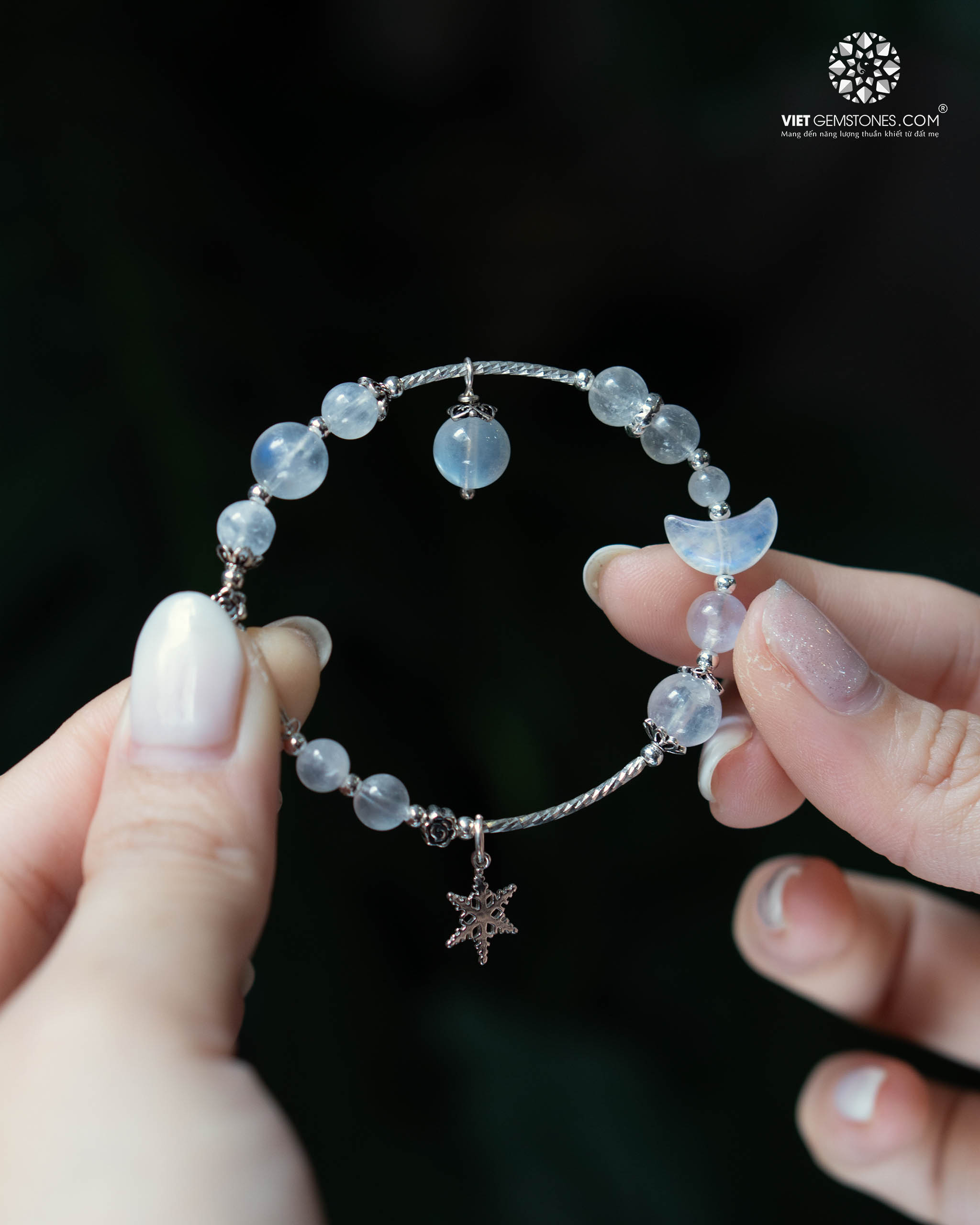 Chất liệu: Đá Moonstone tự nhiên kết hợp charm bạc cao cấp