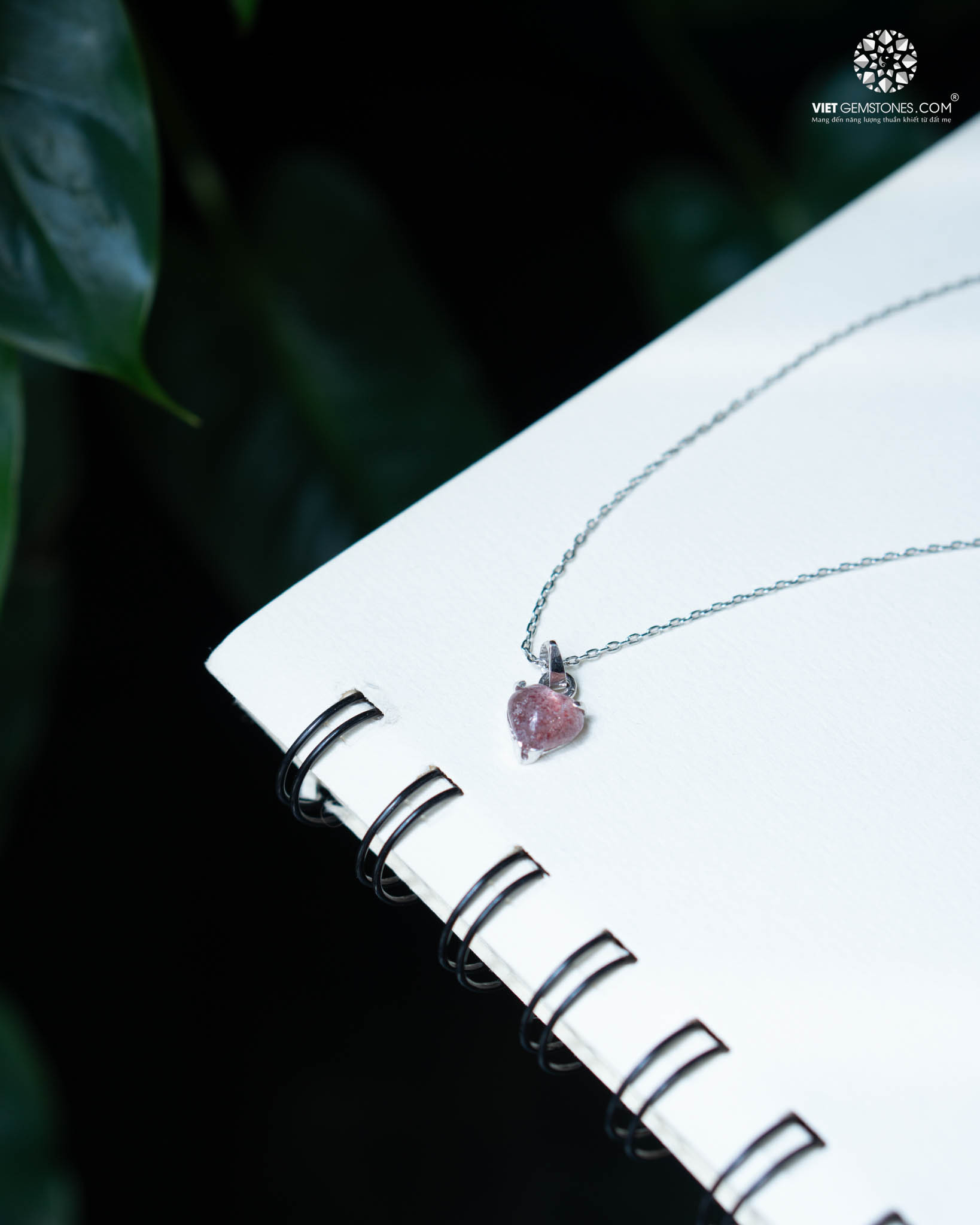 Viên Thạch Anh Dâu Tây tự nhiên được cắt theo hình trái tim mềm mại, nổi bật với sắc hồng ngọt ngào cùng các chấm li ti đặc trưng như hạt dâu, tạo nên vẻ đẹp vừa lãng mạn vừa độc đáo.