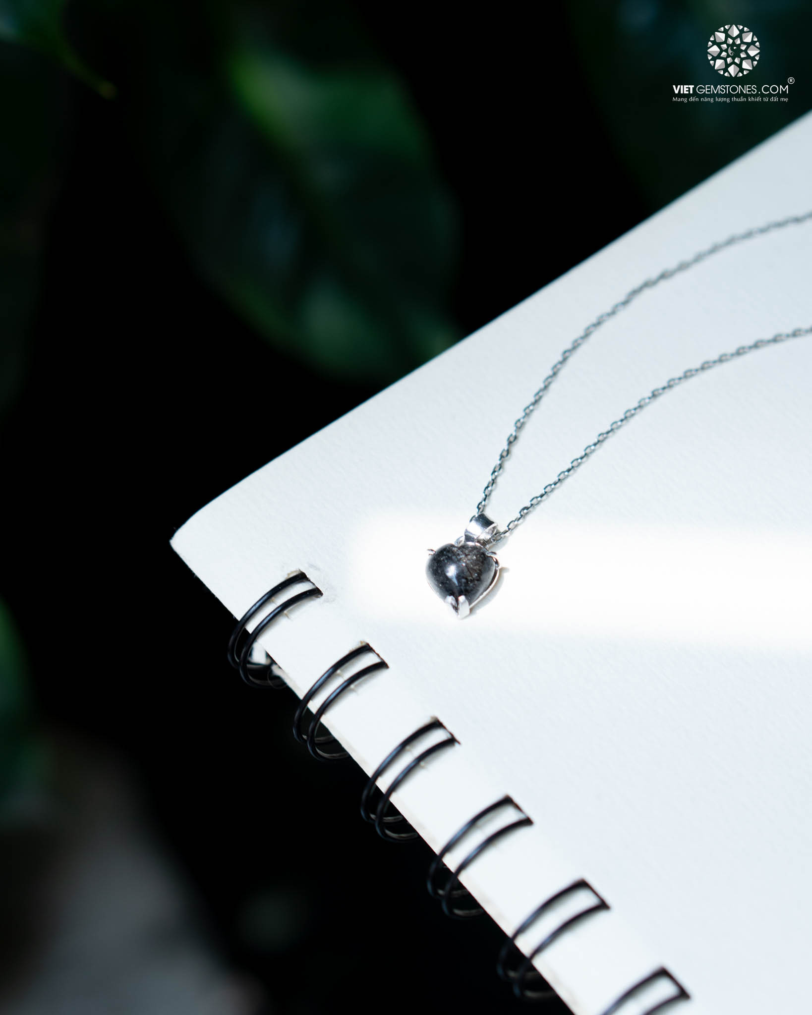 Thạch Anh Tóc Đen tự nhiên được cắt hình trái tim, nổi bật với những sợi "tóc" đen huyền ẩn hiện bên trong lớp đá trong suốt. Đây là một trong những dòng đá phong thủy mạnh mẽ, mang lại cảm giác vững vàng và được bảo vệ.