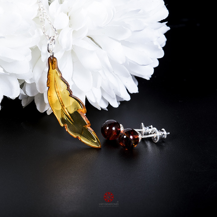 Bộ sản phẩm bông tai và mặt dây chuyền chế tác từ Amber - Hổ phách