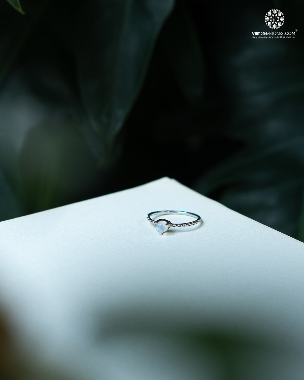 Phong cách tối giản: Chiếc nhẫn được thiết kế gọn gàng, đơn giản nhưng tinh tế, tập trung tôn vinh viên đá mặt trăng ở trung tâm.