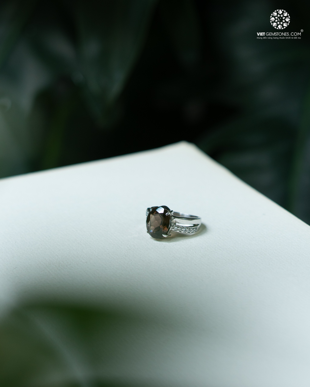 Viên Thạch Anh Khói tự nhiên hình oval, được cắt facet tỉ mỉ, tạo nên độ lấp lánh và chiều sâu tinh tế khi phản chiếu ánh sáng.
