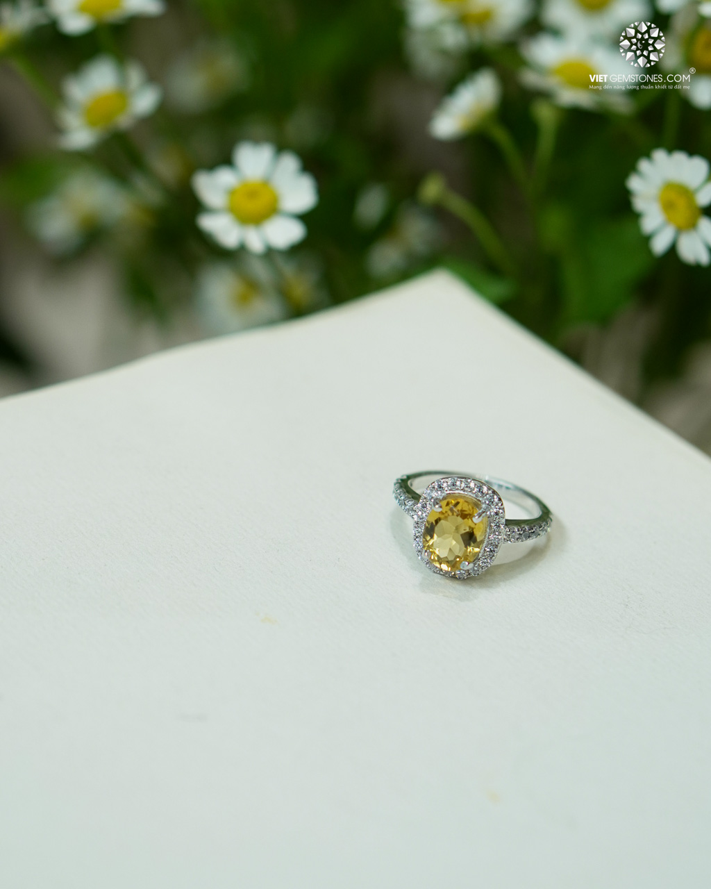 Thạch anh vàng Citrine nổi bật với sắc vàng chanh đến vàng mật ong trong trẻo, khả năng bắt sáng tốt và độ trong cao. Viên đá được cắt gọt oval tỉ mỉ, bao quanh bởi viền đá trắng nhỏ tạo hiệu ứng lấp lánh, giúp tôn lên vẻ đẹp rực rỡ của viên đá chủ. Mỗi viên Citrine có sắc độ riêng, hình thành tự nhiên, mang giá trị độc bản cho từng chiếc nhẫn.