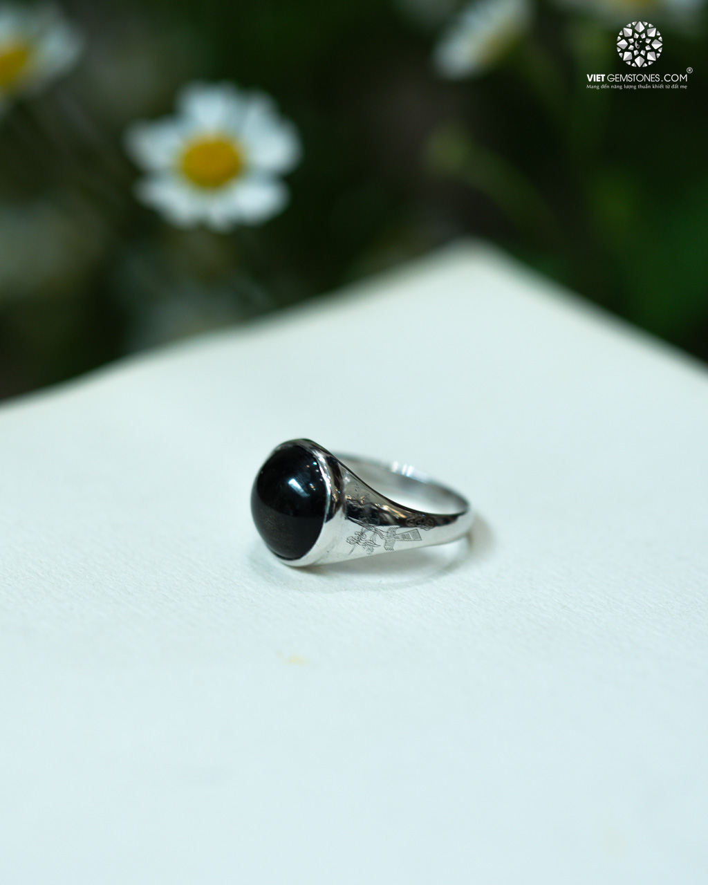 Đá Rainbow Obsidian tự nhiên, sắc đen sâu kết hợp hiệu ứng ánh cầu vồng ẩn hiện dưới ánh sáng, tạo chiều sâu mạnh mẽ và cuốn hút. Nhẫn được chế tác trên nền bạc nam chắc chắn, phong cách sang trọng và nam tính.