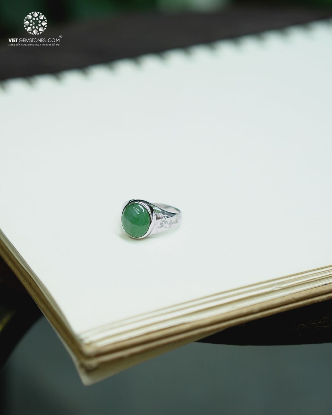 Nhẫn bạc nam ngọc cẩm thạch mang phong cách mạnh mẽ, tối giản nhưng đầy tinh tế. Viên đá cẩm thạch xanh tự nhiên nổi bật trên nền bạc sáng, tạo điểm nhấn sang trọng và nam tính cho người đeo.