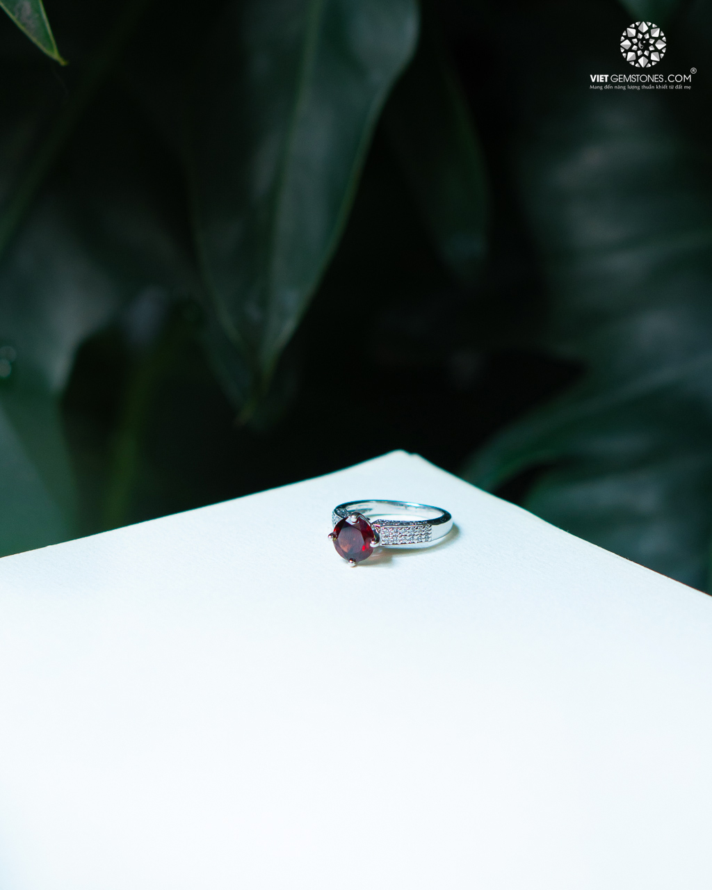 Viên ngọc hồng lựu được đặt ở trung tâm, với khung bạc dày tạo cảm giác mạnh mẽ và vững chãi.