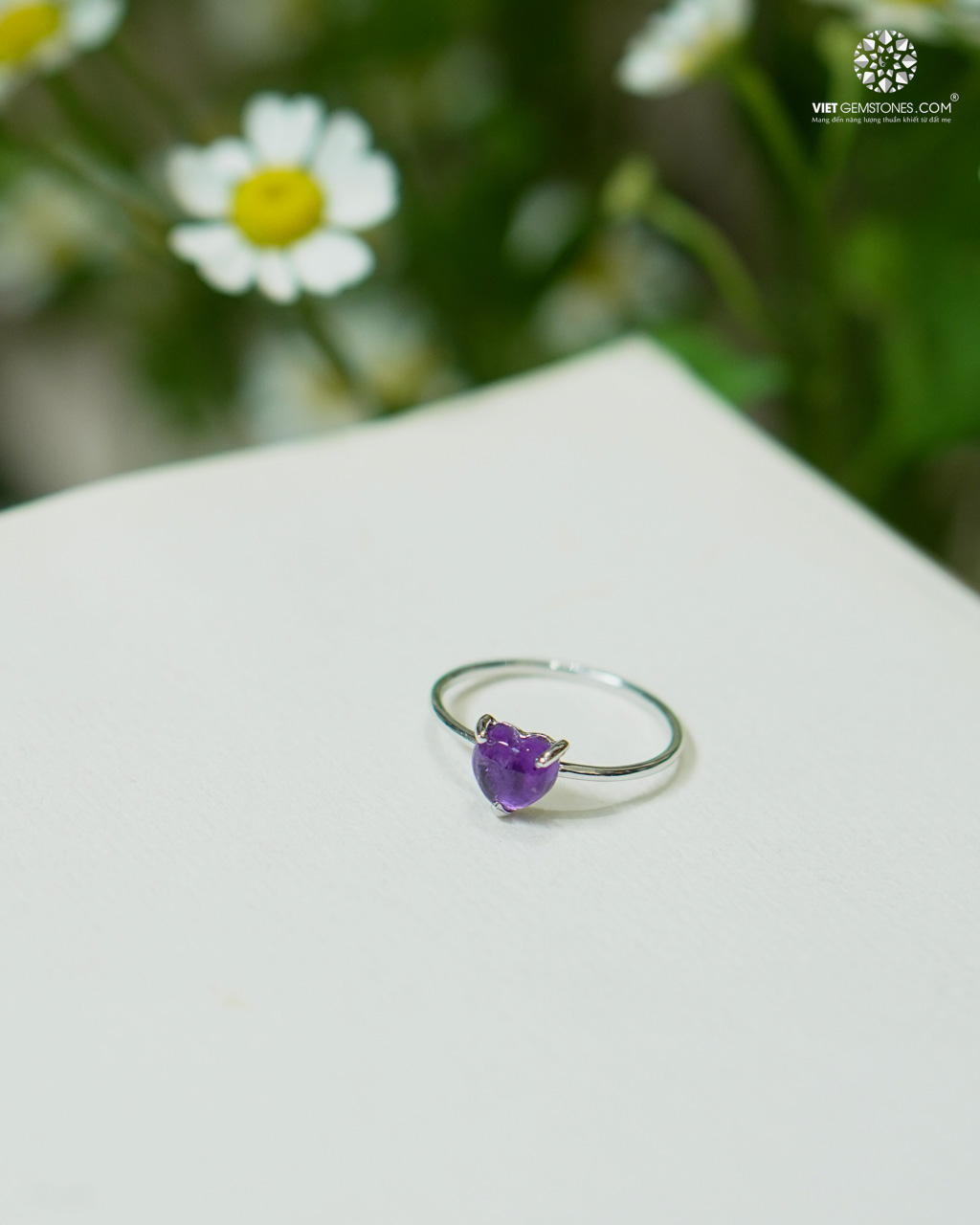 Thạch anh tím nổi bật với sắc tím lavender đến tím đậm quyến rũ, ánh đá trong trẻo và chiều sâu tự nhiên. Viên đá được cắt gọt khéo léo theo dáng trái tim, tôn lên vẻ nữ tính và lãng mạn. Mỗi viên đá có sắc độ và vân riêng, hoàn toàn tự nhiên, tạo nên nét độc bản cho từng chiếc nhẫn.