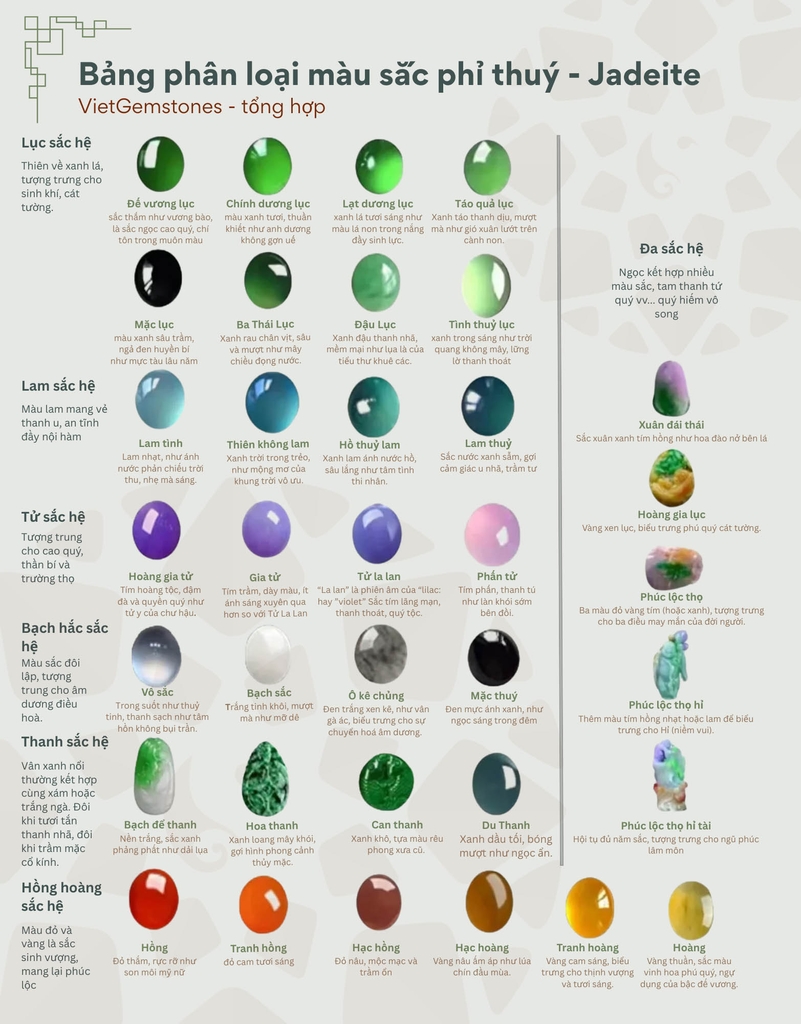 • Đế vương lục (帝王绿): Xanh đậm rực rỡ, ánh như lục bảo. Rất hiếm, tượng trưng cho quyền lực và sự bất khả xâm phạm.