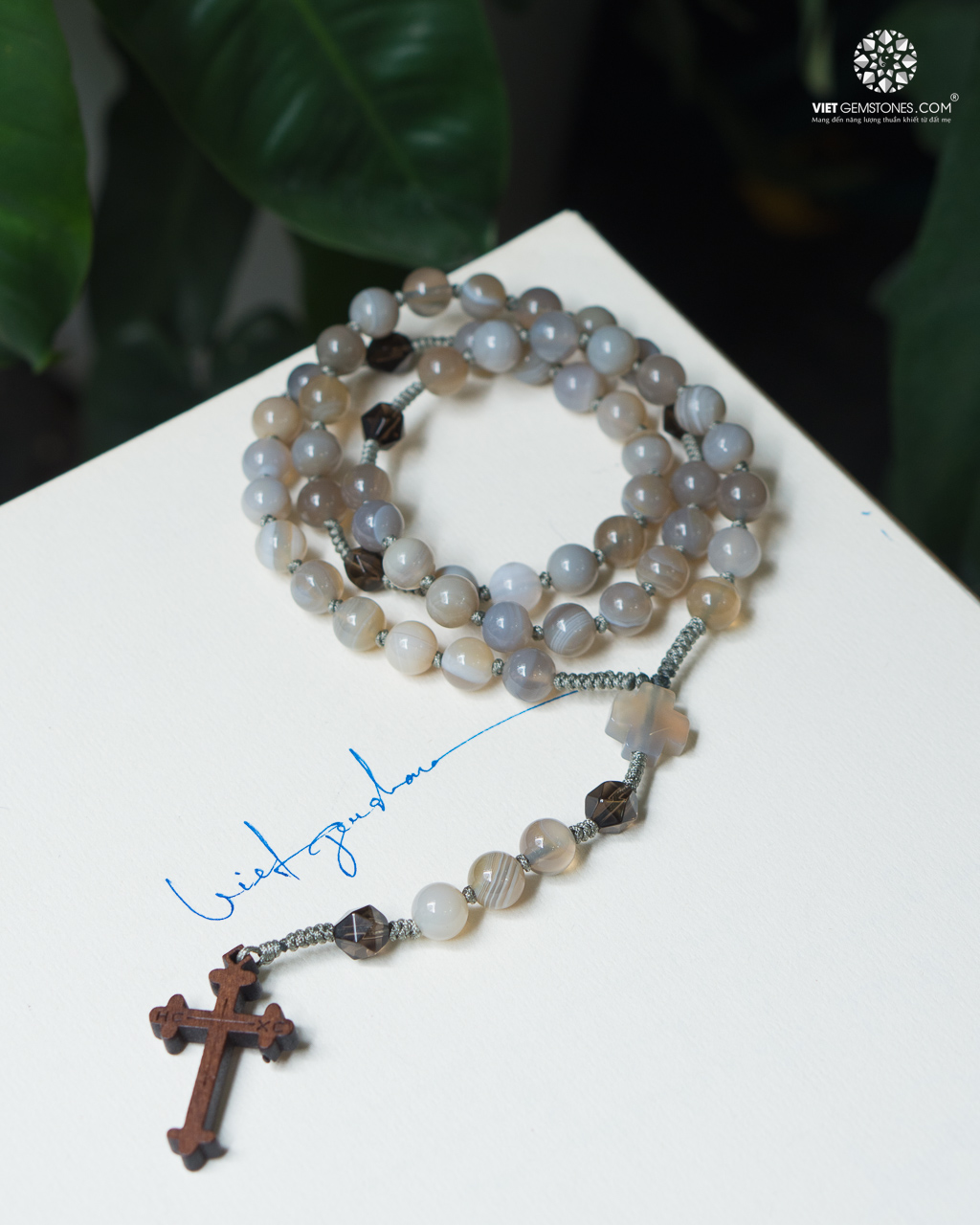 • Hạt chính làm từ Botswana Agate tự nhiên, kích thước 8mm, với màu sắc đặc trưng là các dải vân mờ huyền bí và tinh tế, mang vẻ đẹp độc đáo và sang trọng.