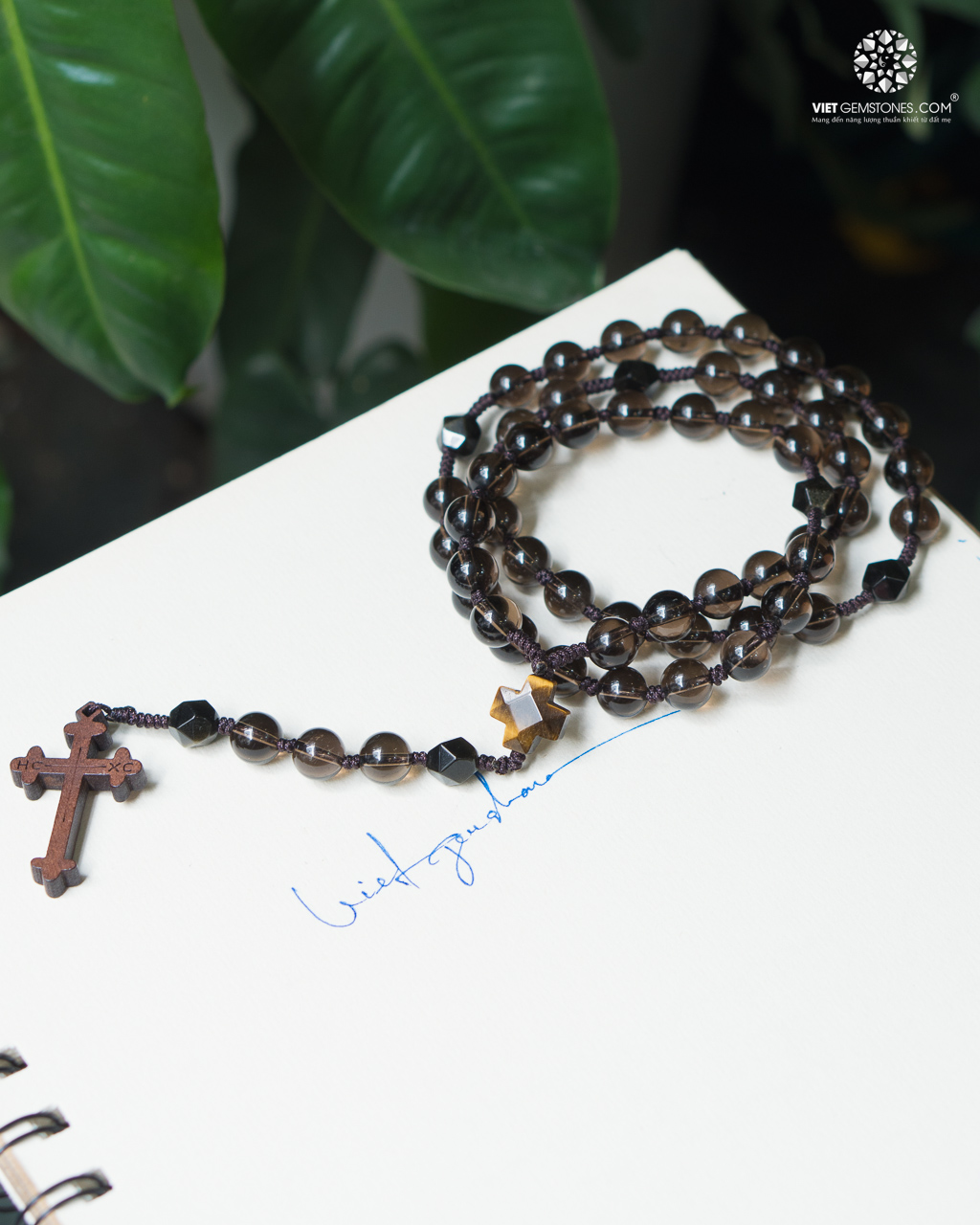 Hạt chính: Thạch Anh Khói 10mm, nâu trầm huyền bí, biểu tượng bảo vệ và cân bằng.
