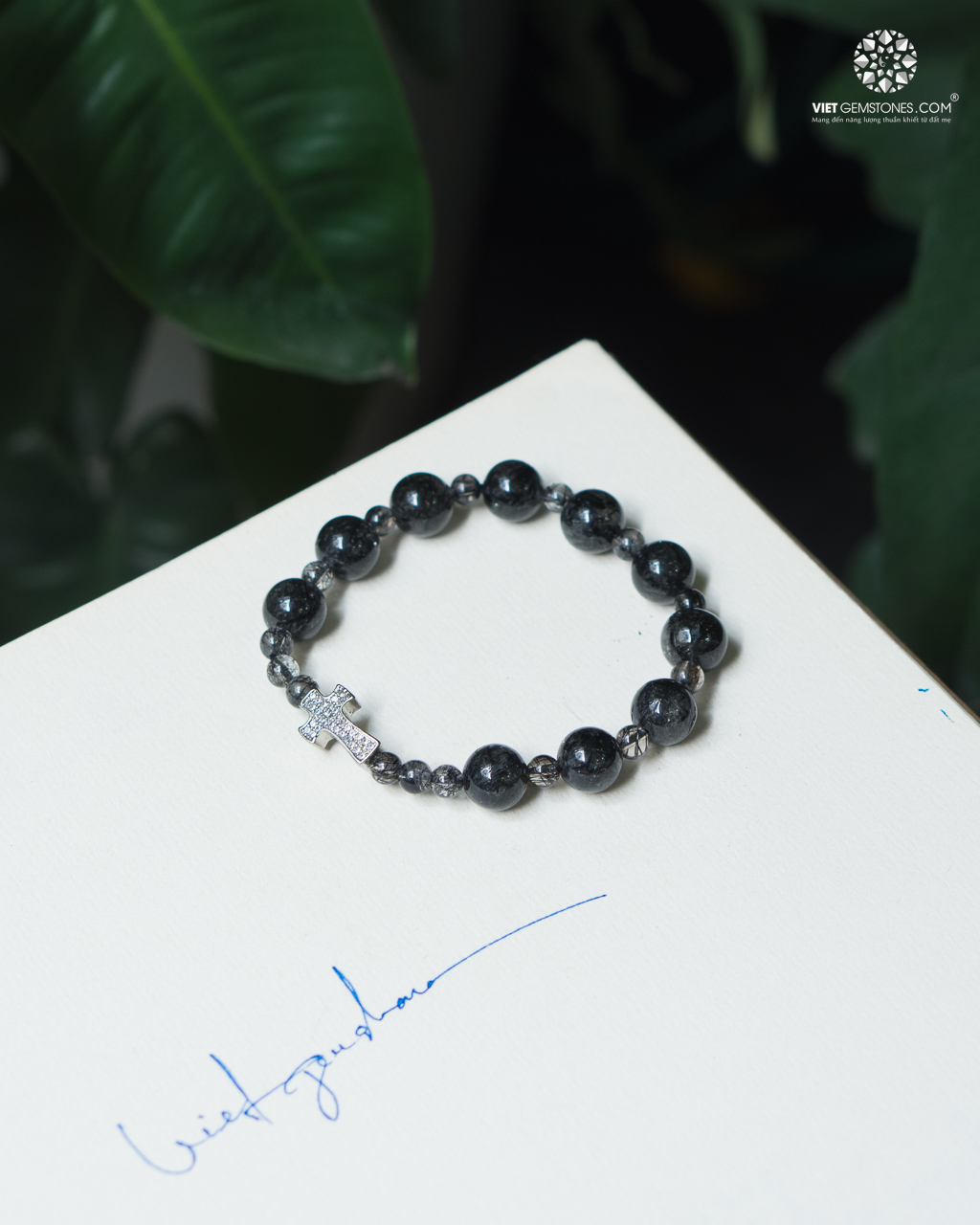 Hạt chính làm từ Thạch Anh Tóc Đen tự nhiên, kích thước 9mm, mang vẻ đẹp huyền bí với các sợi tóc đen đặc trưng bên trong.