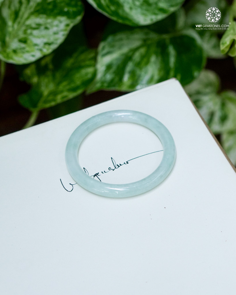 Vòng tay cẩm thạch Jadeite nổi bật bởi sắc xanh nhạt trong trẻo điểm xuyết những đường vân tự nhiên đầy tinh tế. Đây là món trang sức hoàn hảo, không chỉ mang vẻ đẹp thanh thoát, sang trọng mà còn chứa đựng giá trị phong thủy may mắn và bình an.