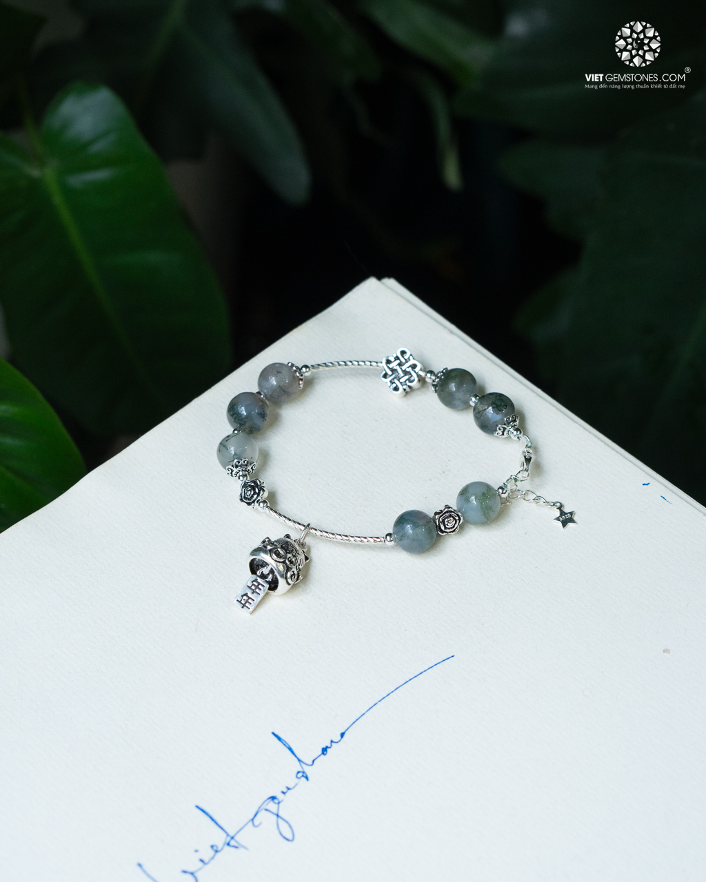 Chất liệu: Đá Băng Ngọc Thủy Tảo (Moss Agate) kết hợp với charm bạc Thái 92,5%.