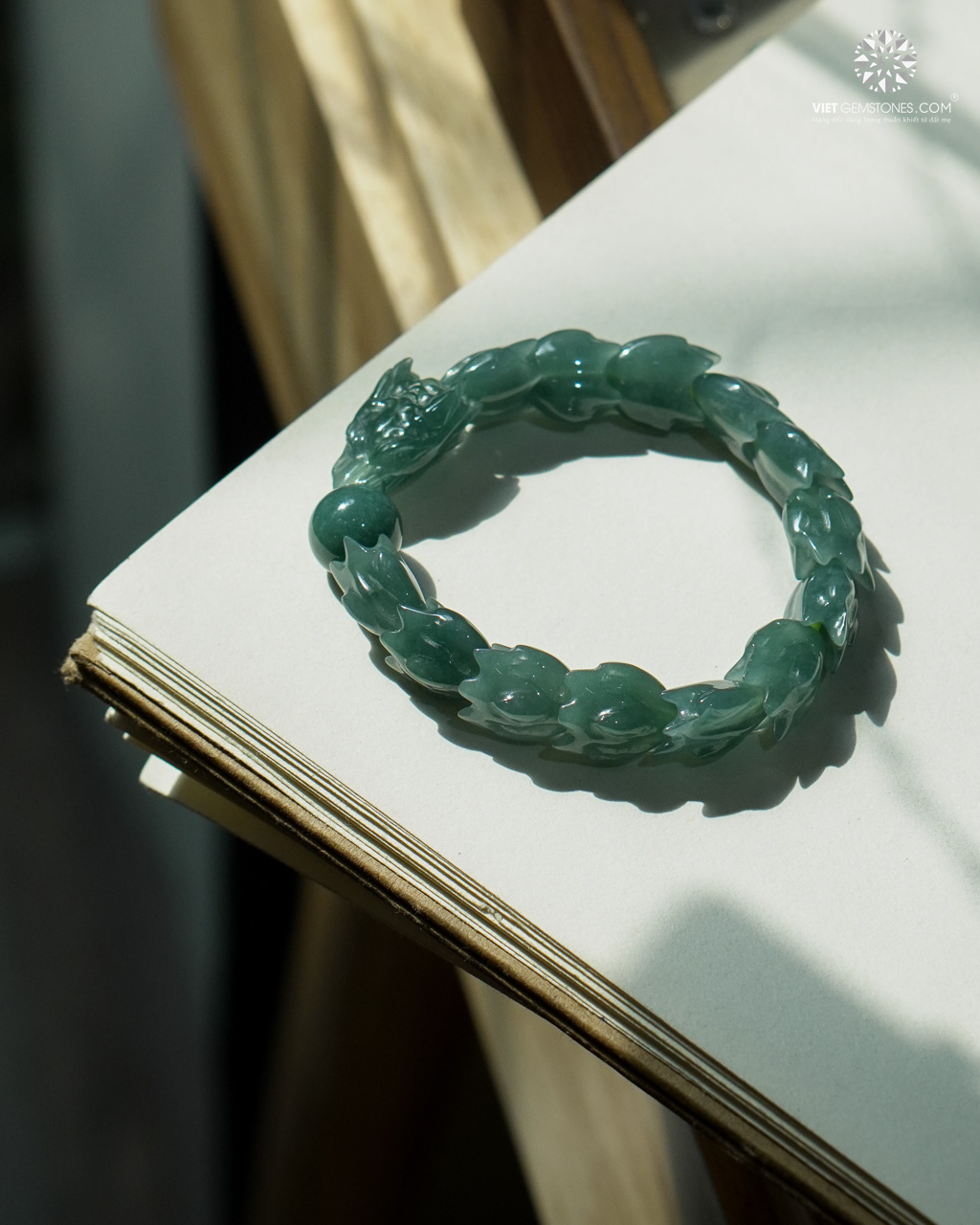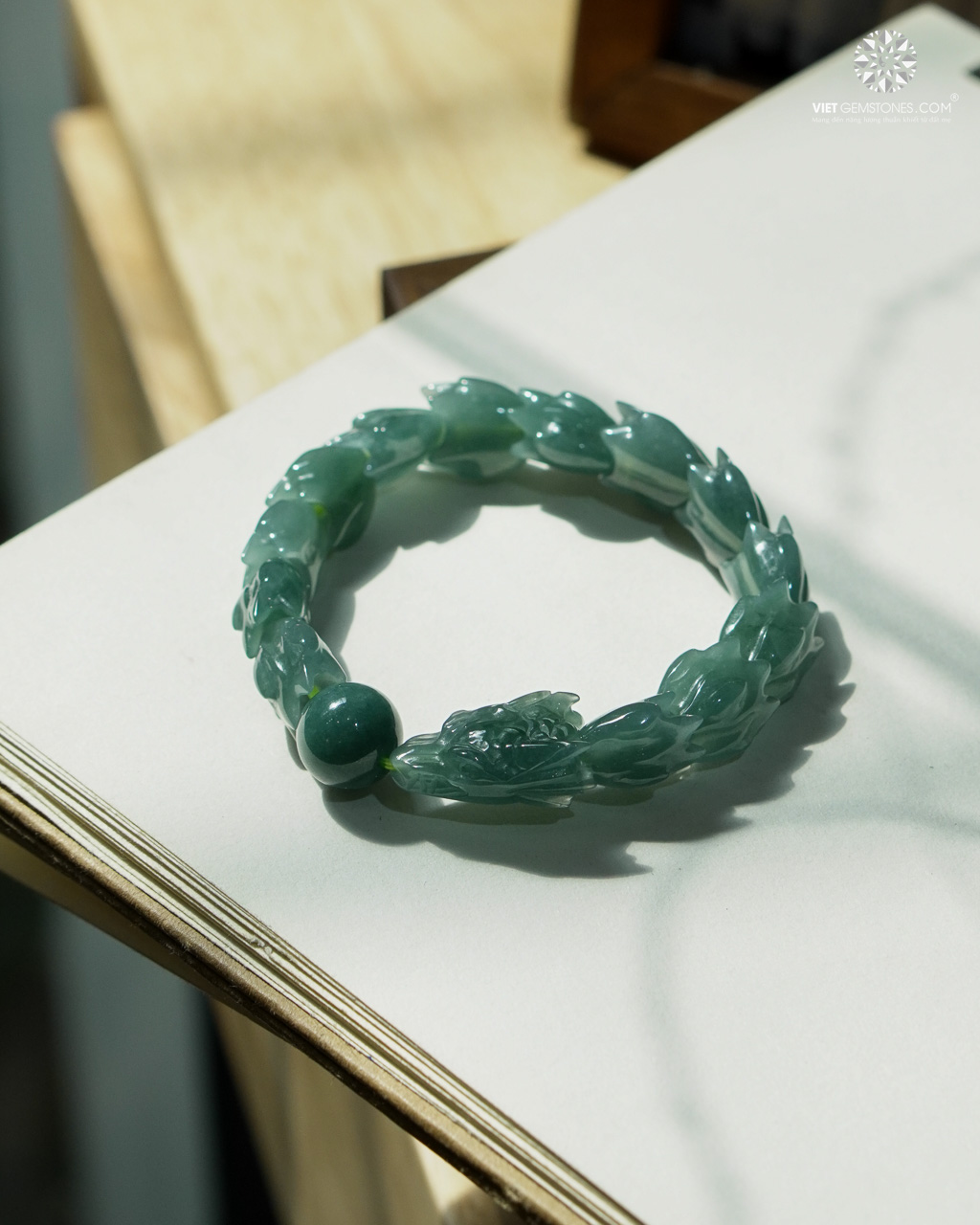 Những chi tiết rồng ẩn trong thân ngọc được chạm khắc mềm mại, uyển chuyển như đang chuyển động giữa làn mây nước. Sắc lam ngọc tự nhiên xanh trầm, ánh ngọc sâu và mịn, tạo nên tổng thể vừa sang trọng vừa đầy chiều sâu nội lực.